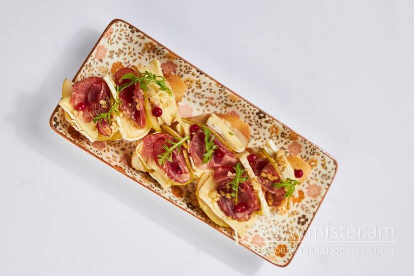 Багет, масло, груша, шинка Коппа, сир Брі, горіх грецький, руккола, мед.