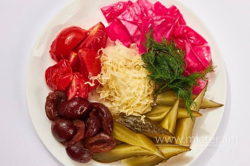 Капуста квашена, крижавки, огірки, помідори, слива маринована.