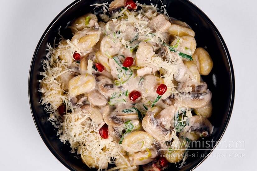 Ньокі картопляні, печериці, цибуля порей, часник, вершки, сир пармезан.