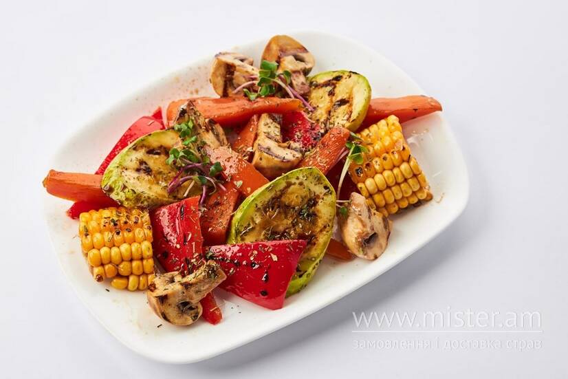 Шампіньйони, перець болгарський, морква, кабачки, кукурудза.