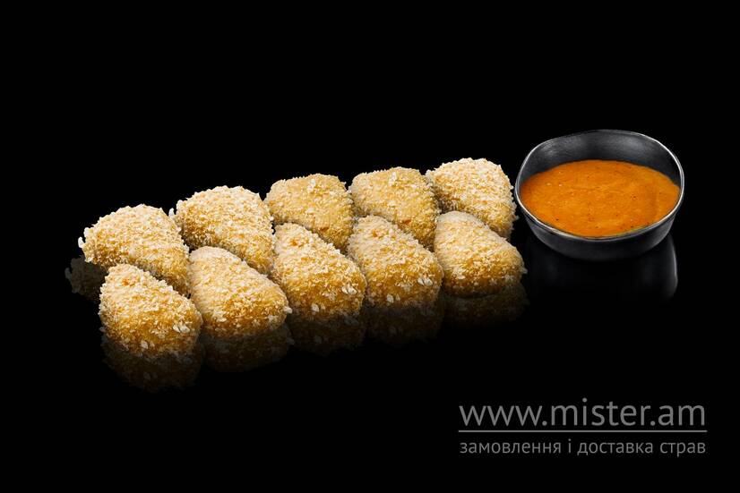 Моцарела, яйце, панірувальні сухарі, борошно темпура, соус горіховий (гострий).