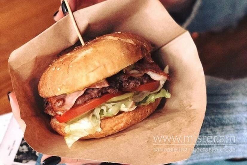 Яловича котлета, смажений бекон, салат Айсберг, маринований огірок, свіжий помідор, карамелізована цибуля, солус Барбекю та гірчиця.