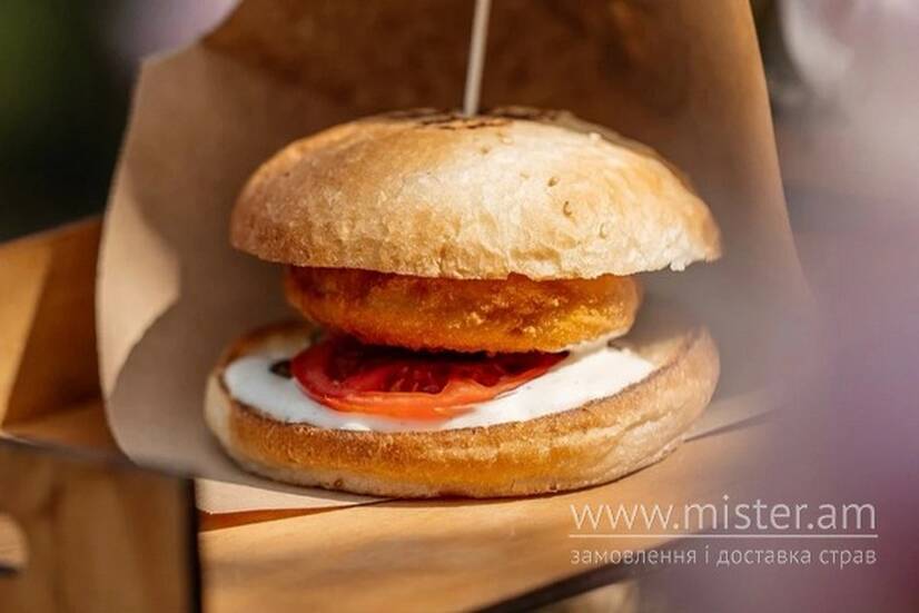 Куряча котлета, свіжий помідор, маринований огірок та вершковий соус.