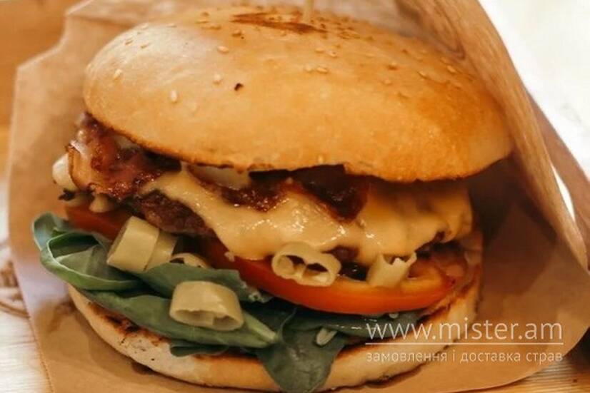 Яловича котлета, сир Чедер, бекон, шпинат, гострий маринований перець, свівжий помідор, соус папрік та гірчиця.