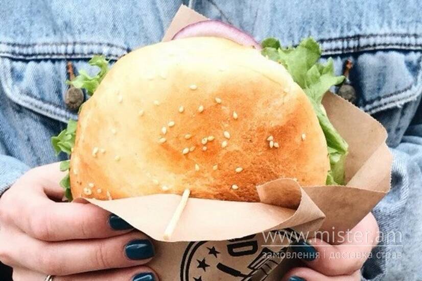 Яловича котлета, салат Айсберг, маринований огірок, свіжий помідор, маринована цибуля, фірмовий соус та гірчиця.