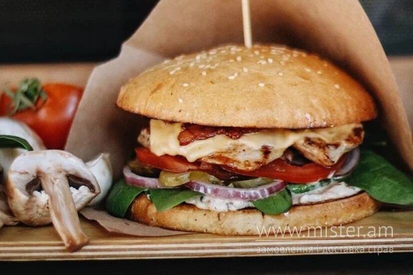 Куряче філе, бекон, сир Гауда, шпинат, маринований огірок, свіжий помідор, маринована цибуля, грибний соус та гірчиця.