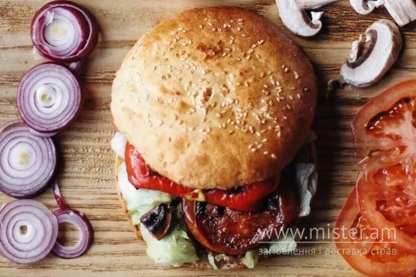 Кабачок, перець, печериці, помідор, цибуля, салат Айсберг, соус Барбекю та гірчиця.