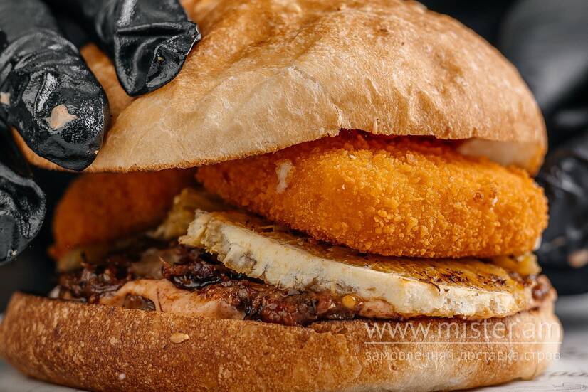 Мармурова рвана яловичина, підсмажений апельсин, цибуля, Моцарела фрі, пікантний соус та діжонська гірчиця.