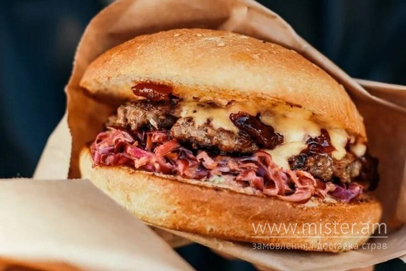 Яловича котлета, сирний соус, вишневий конфітюр, салат Коул Соул, фірмовий соус.