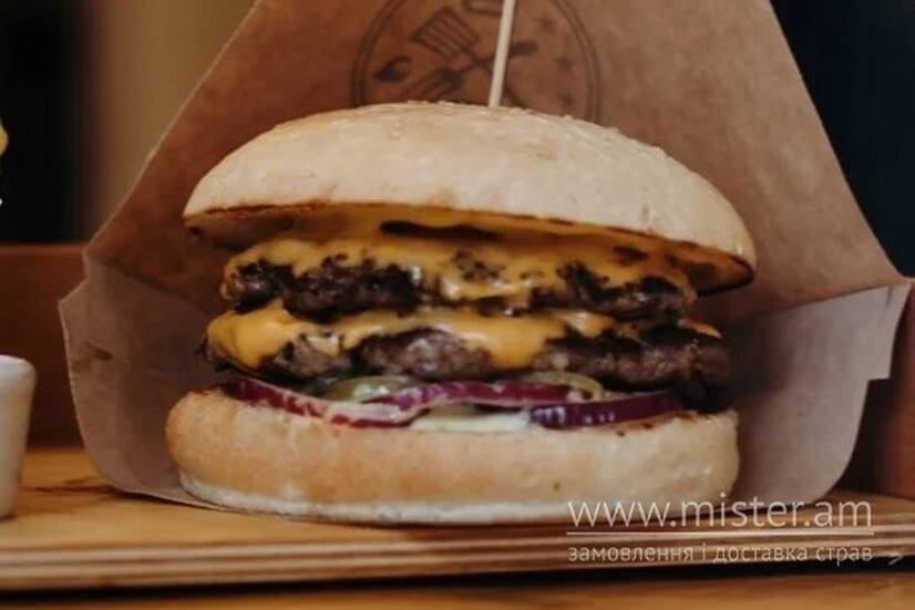 Дві яловичі котлети, сир Чедер, маринований огірок, маринована цибуля, фірмовий соус та гірчиця.