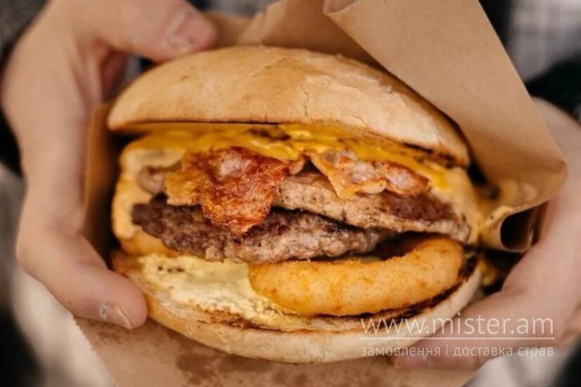 Яловича котлета, індича котлета, смажений бекон, сирний соус, цибулеві кільця, гірчиця та фірмовий соус.