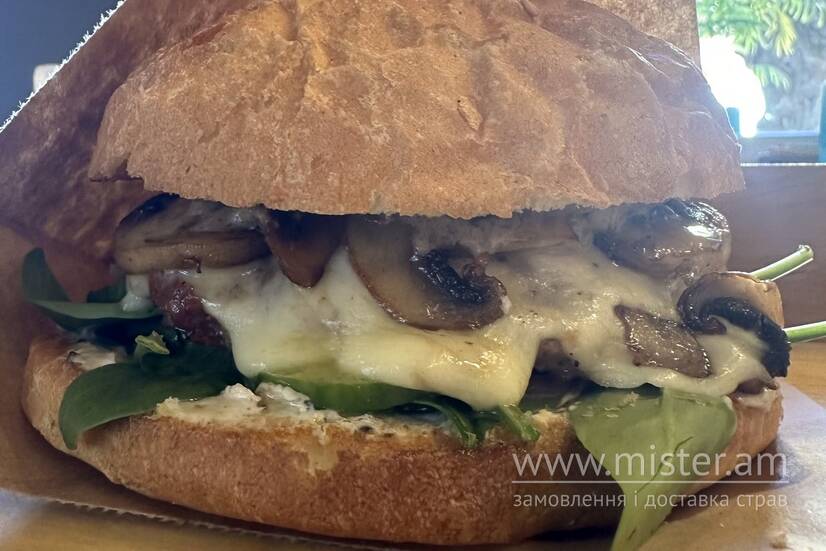 Яловича котлета, сир Моцарела, свіжий огірок, свіжий помідор, маринована цибуля, смажені печириці, шпинат, трюфільне масло та крем-сир з трюфелем.