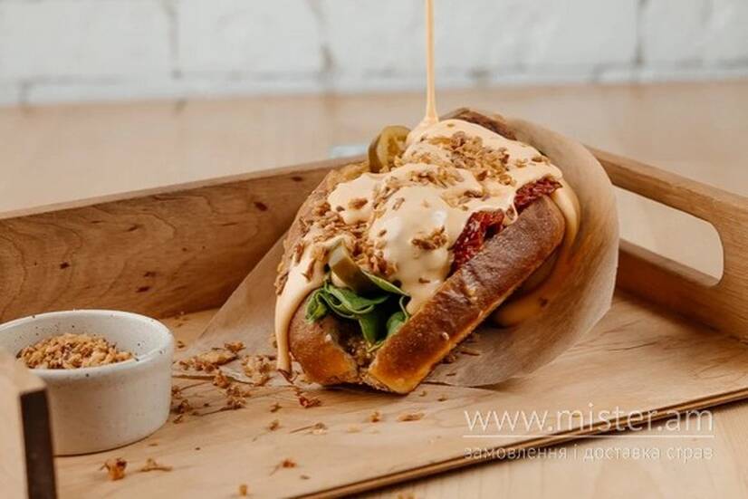 Індича сосиска в беконі (власного виробництва), шпинат, в`ялені помідори, смажена суха цибуля, діжонська гірчиця, вершковий та сирний соус.