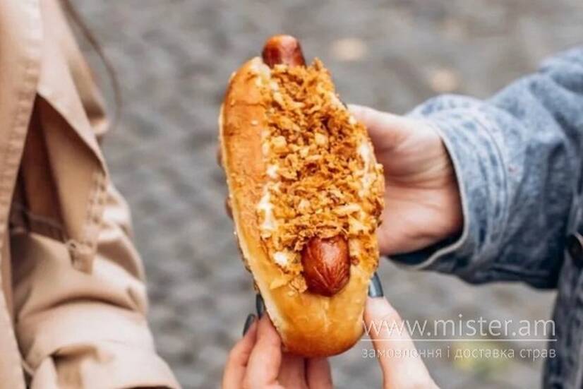 Сосиска напівкопчена, сирний соус, мариновані огірки, цибуля суха смажена, соус папрік та діжонська гірчиця.
