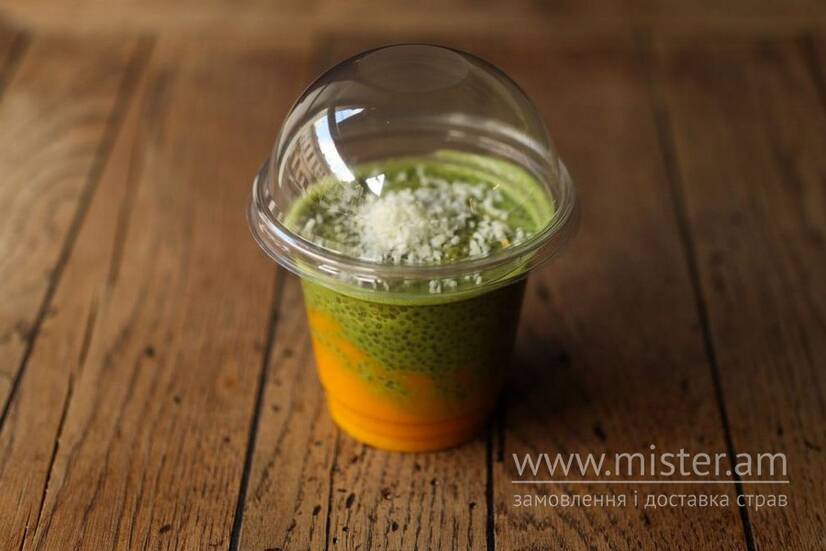 Антиоксидантний Чіа-пудинг із соковитим пюре манго, доповнену мигдалевим молоком із куркумою, імбиром і медом. Кокосова стружка завершує смак.