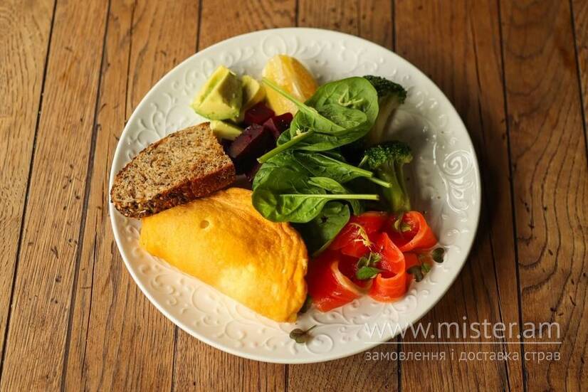 Ніжний омлет із збитих яєць поєднується з кремовим авокадо та ароматним вершковим маслом, приправленим кропом, лимонним соком і легкою ноткою імбиру. Страва доповнена соковитим лососем і гарніром зі свіжих та відварених овочів — броколі, шпинату, буряка та селери. Подається з теплим цільнозерновим хлібом.