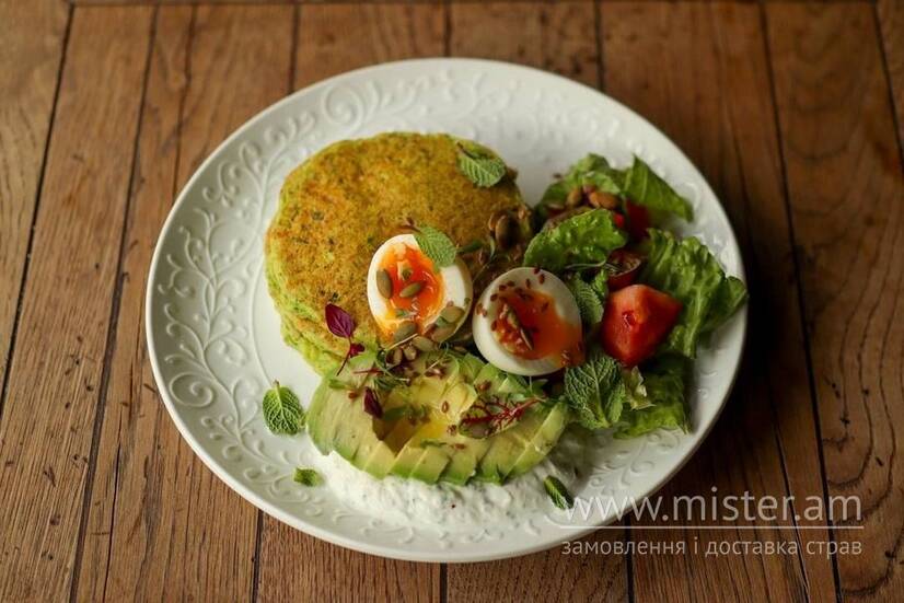 Ніжні панкейки з броколі та шпинату із додаванням пармезану та рисового борошна, приправлені сіллю, перцем і сушеним часником. Із йогуртовим соусом. Подаються з вареним яйцем, авокадо, томатом та зеленню, прикрашені хрустким насінням гарбуза та льону.