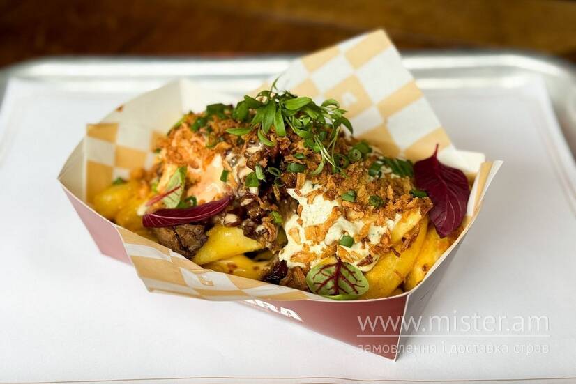 Рвана яловичина з карамелізованим беконом з фірмовою картоплею. Доповнена міксом із чотирьох соусів: блек пепер, барбекю, спайсі та сирного. Завершується хрумким цибулевим кранчем, маринованими корнішонами та свіжою зеленню.