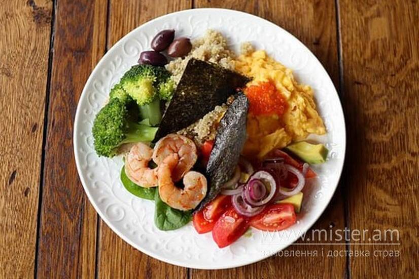 Ніжний скрембл із креветками та червоною ікрою, соковитими томатами чері, кремовим авокадо, червоною цибулею та броколі. Доповнений листям норі, шпинатом, білою кіноа та мікрогріном. Завершення — кунжутний соус, каламата-оливки.