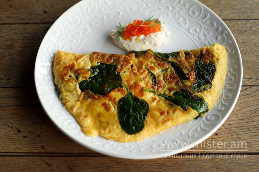 Ніжний вершковий омлет зі шпинатом, двома видами сиру — чедером та моцарелою, обсмажений на вершковому маслі. Подається із мусом із сиру Філадельфія та сметанного соусу та червоною ікрою.