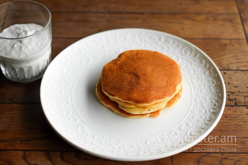 Ніжні панкейки з рікоти, доповнені освіжаючим соусом на основі густого грецького йогурту. У складі — натертий огірок, краплі лимонного соку, крапля оливкової олії, ароматний часник та щіпка кропу.