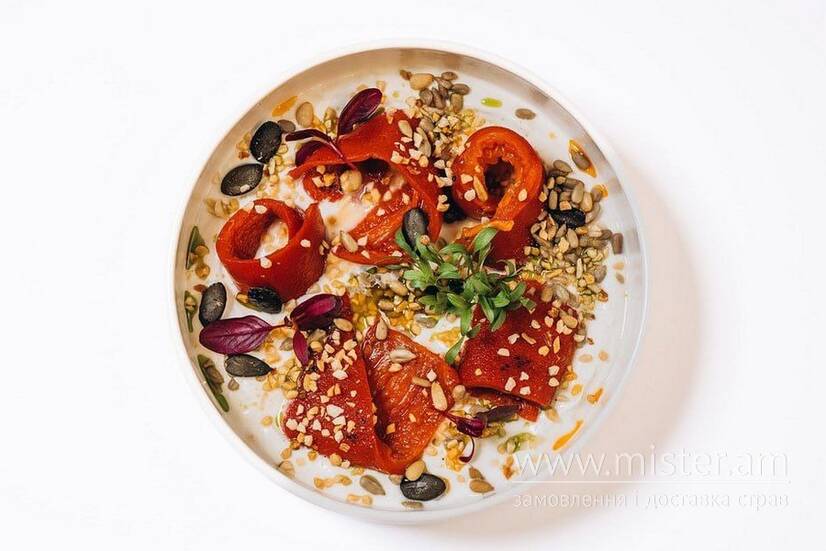 Запечені на грилі перці, що подаються з мацоні та міксом насіння.