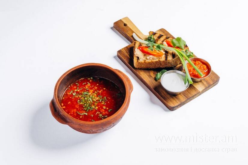 Борщ з телятиною, подається з грінками шоті, меленим салом та сметаною.