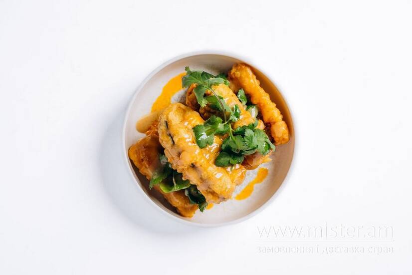 Хрумкий баклажан та цукіні з горіховим соусом та кінзою.