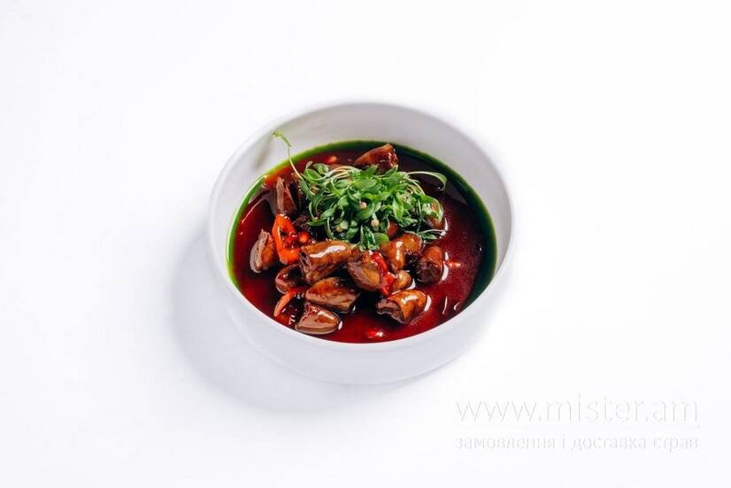Курячі сердечка в соусі наршараб з чилі, гранатом та кінзою.