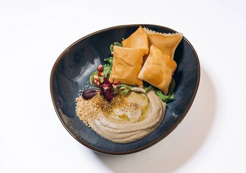 Пюре з баклажана, тахіни та мацоні. Подаємо з хрумкими хлібцями.