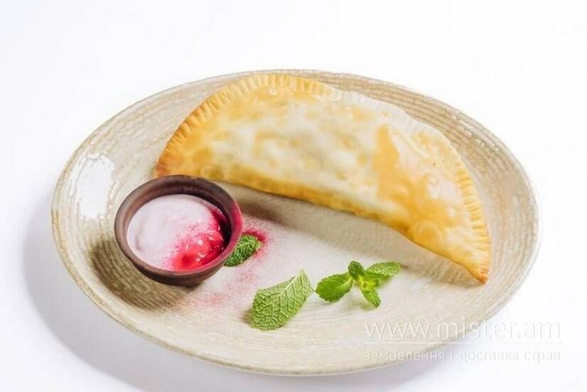 Хрумкий чебурек з соковитими вишнями з ягідним мацоні.