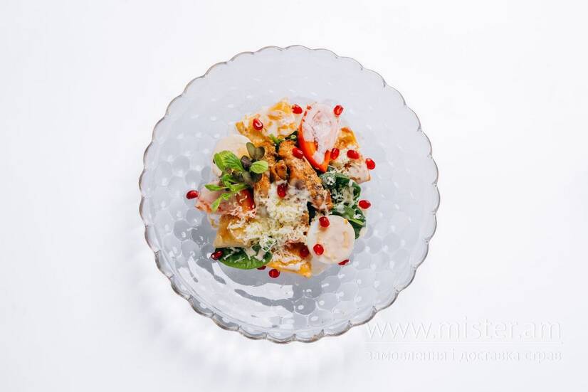 Салат з курячим стегном на грилі, томатами, сиром сулугуні та яйцем, заправлений соусом тевзі.