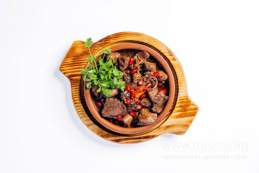 Традиційна страва з курячих сердець та печінки з гранатом, цибулею, чилі.