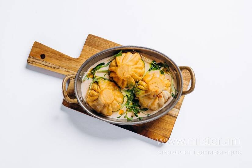 Хрусткі хінкалі, подаються з соусом шкмерулі.