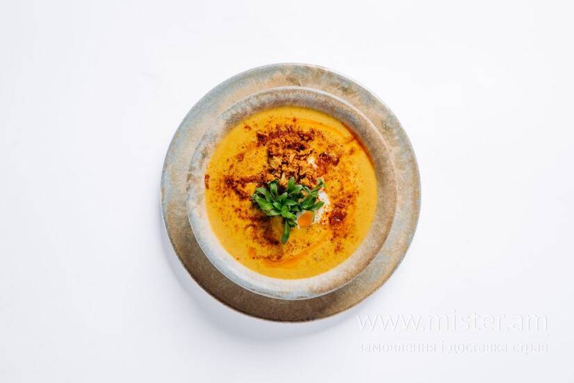Крем-суп з сочевиці та овочів, приправлений грузинськими спеціями.