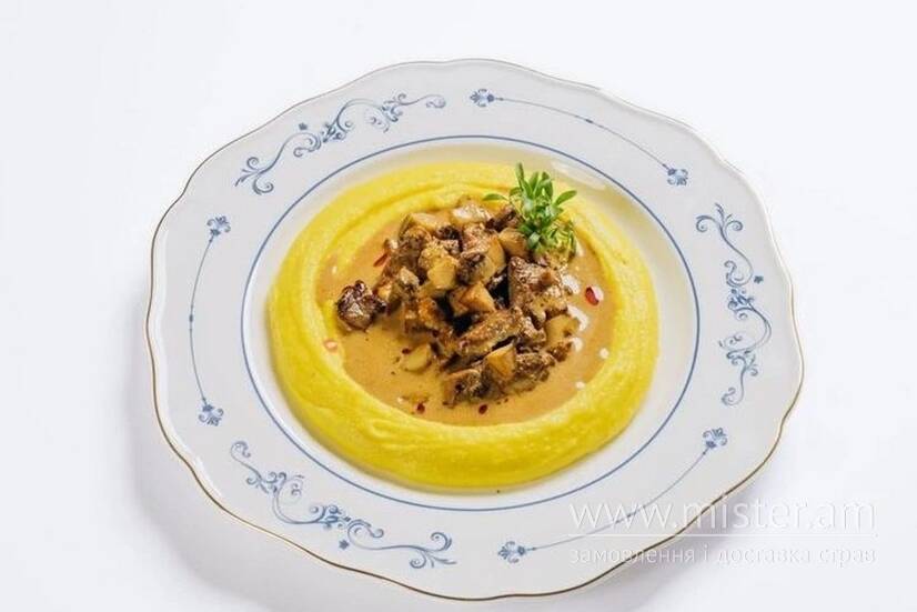 Картопляне пюре з сиром сулугуні подаємо з телятиною та печерицями у вершковому соусі.