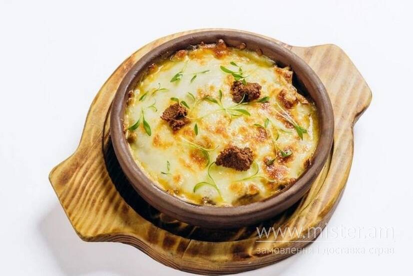 Томлене м`ясо ягня з печерицями, у вершковому соусі, запечені в кеці під сиром сулугуні.