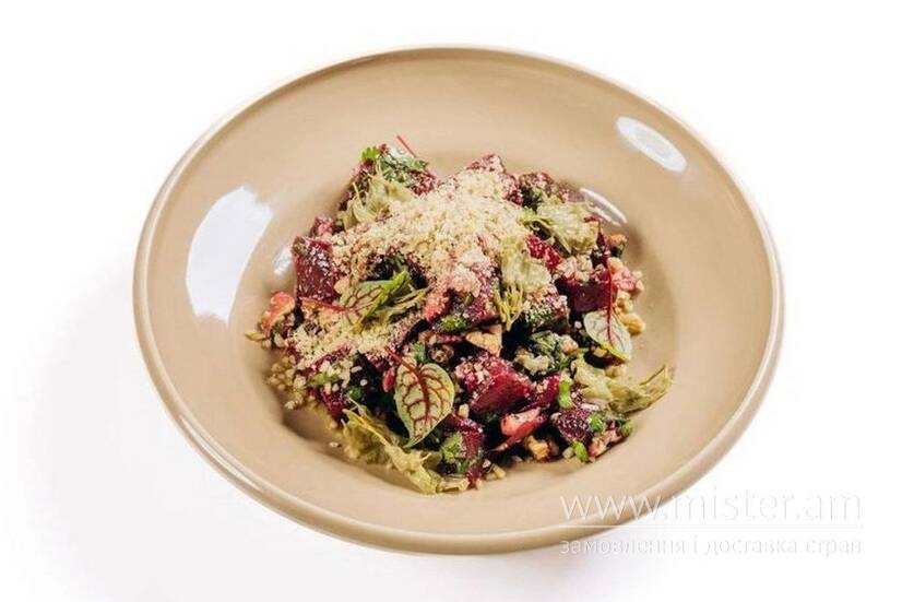 Cалат з печерного буряка, заправлений домашньою олією, зі сванською сіллю, горіхом та кінзою.