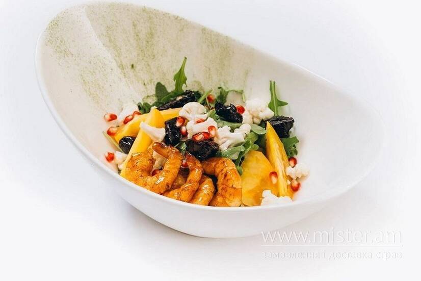 Руккола з креветками, жовтими томатами, цвітною капустою, копченою сливою та гранатом. Заправляється гранатовим соусом.