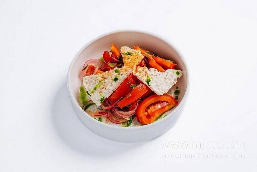 Свіжі томати з соєвим сиром, червоною цибулею та домашньою олією.