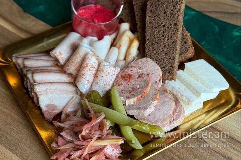 Ковбаса домашня рублена, сало солене, сало паприкове, підчеревина копчена, сир бринза, квашені огірки, Маринована цибуля, хліб, соус хрін.