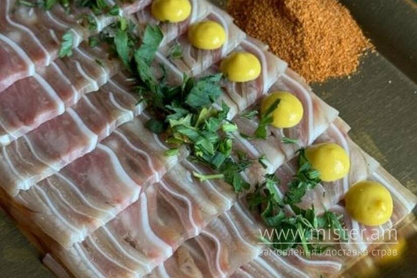 Свинні вуха, спеції, зелень, гірчиця.
