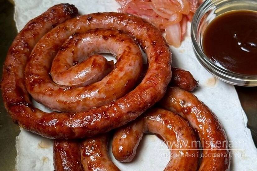 Купати карамелізовані в соусі BBQ, подаються з маринованою цибулею та соусом.