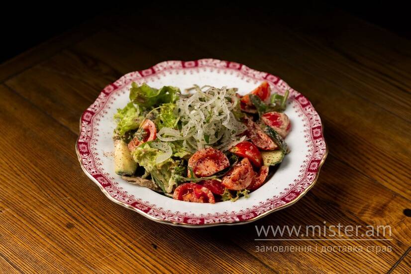 Хрусткий баклажан та м`який імеритинський сир у поєднанні з салатним міксом у соусі теріякі