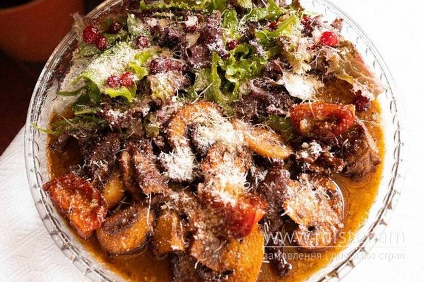 Яскравий смак грильваної телятини та грибів у гранатовому соусі