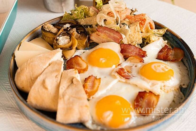 Грузинські сири, оката яєчня або скрамбл з трьох фермерських яєць, підсмажений бекон, грузинський салат, рулетики з баклажанів, шоті.