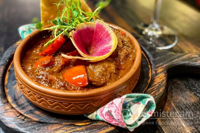М`ясо тушковане у власному соці, багряному Сапераві та пряному томатному пюре. Подаємо з теплим шоті, яким так смачно вимочувати ароматний соус з кеци.
