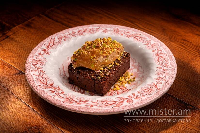 Насичений шоколадний кекс із пряними нотами, грушевим джемом та хрусткою фісташкою.