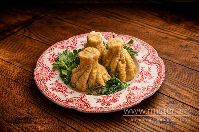 Хрусткі смажені хінкалі з грибною начинкою, подані з насиченим грибним соусом.