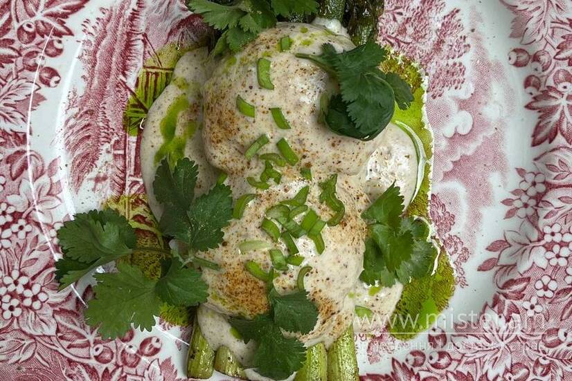 Спаржа з пашотом та соусом чкмерулі